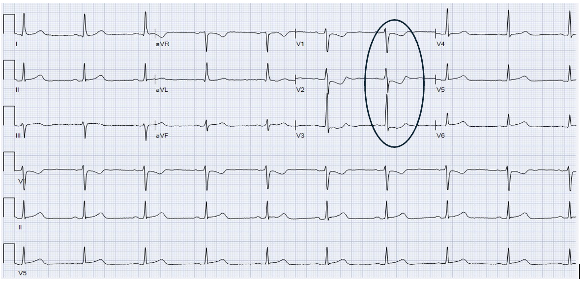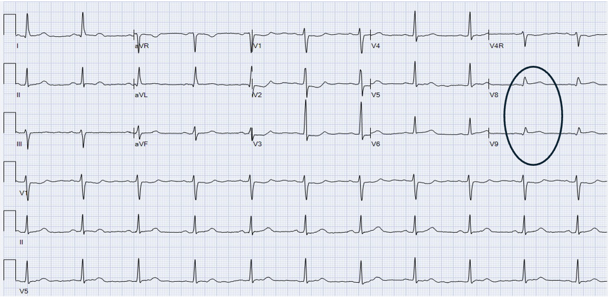 A posterior STEMI wasn’t recognized until a 15-lead ECG was finally performed at 9:30 AM, causing a diagnostic delay of 4 hours. ST-elevation (STE) in V8-V9 is evident.