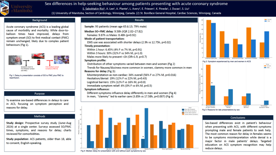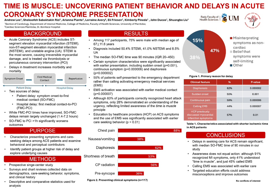 Acute coronary syndrome (ACS) remains the leading cause of death in Canada, and despite improvements in FMC-to-PCI times, delays from symptom onset to first medical contact persist. In this single-centre prospective study of 117 ACS patients (75.2% male, median age 67±11 years), the median SO-FMC delay was 90 minutes, most commonly due to misinterpretation of symptoms as non-cardiac and the belief that symptoms would resolve spontaneously. Chest discomfort, diaphoresis, and shortness of breath were the most frequent symptoms, with sudden onset, continuous symptoms, and diaphoresis associated with earlier presentation. EMS activation was linked to earlier presentation. Although most patients were aware of heart attack symptoms, fewer recognized the urgency of timely care. These findings highlight key targets for focused public education to reduce delays and improve ACS outcomes.
