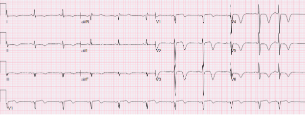 58-year-old man from Thompson with T2DM, HTN, DLD, and current smoking presented with left-sided chest pain and nausea starting Jan 6 @ 02:00. Troponin was elevated and rising (270 → 349 → 482). After presentation, there was no recurrent chest pain. The ECG is shown here: